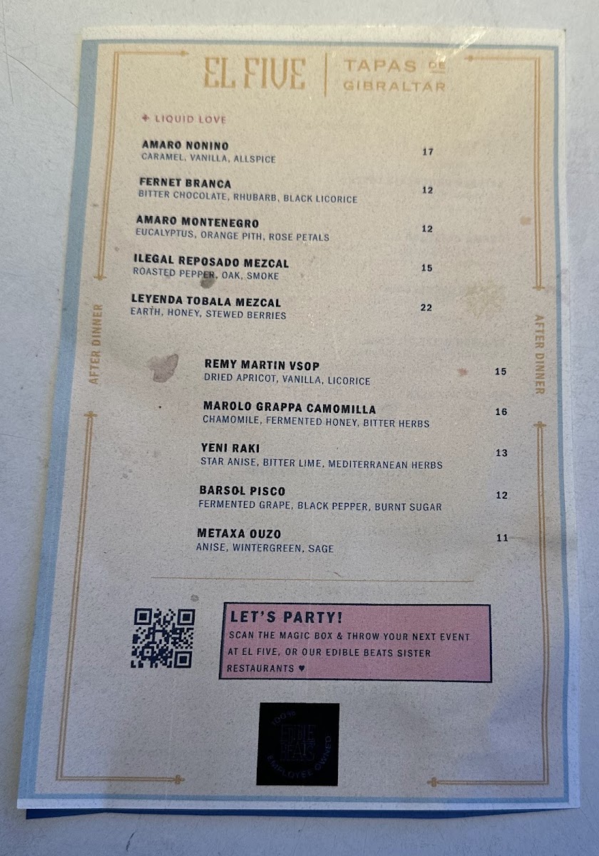 Don't miss dessert tapas like Chocolate Baklava or the exquisite Basque Cheesecake, perfect for a sweet finish. With its stunning ambiance and attentive service, El Five promises a delightful dining experience that invites you to savor every moment.